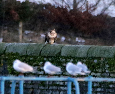 A look at the gulls by the valve tower revealed a brown bird on the distant dam wall which I thought was a 1st year gull but when scoped it turned out to be what had flushed the geese , a Buzzard, the first I,ve ever seen on the dam wall .