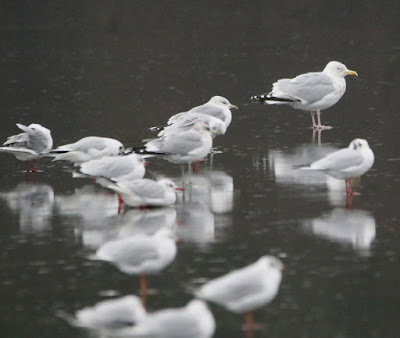 With the reservoir 50% frozen now wildfowl was at a minimum with just 1m and 2f Mallard plus the usual Moorhen on the water whilst small gull numbers were good but only 5 big gulls, these being 1 ad and 4 2cy Herrings.